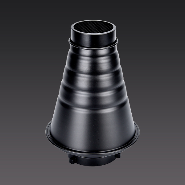 What is photography reflector/video light reflector/studio reflector? It’s a kind of reflector for luminaire used in the studio filming by the photographer. The reflector made by 1090 high purity aluminum. Anodized finishing and black powder coat outer surface. The feature of aluminium reflector is high strength and anti-corrosion, adapt with Bowen slot structure. The function of photography reflector is control the light direction and bring max of illumination to the target object. So the reflector greatly enhance the light utilization. A high efficiency photography reflector is determined by the curve of reflector, material and surface treatment. As per our sudy, an aluminium photography reflector with professional optic design, it’s efficiency has raised over 500% compare with the core light source without reflector.