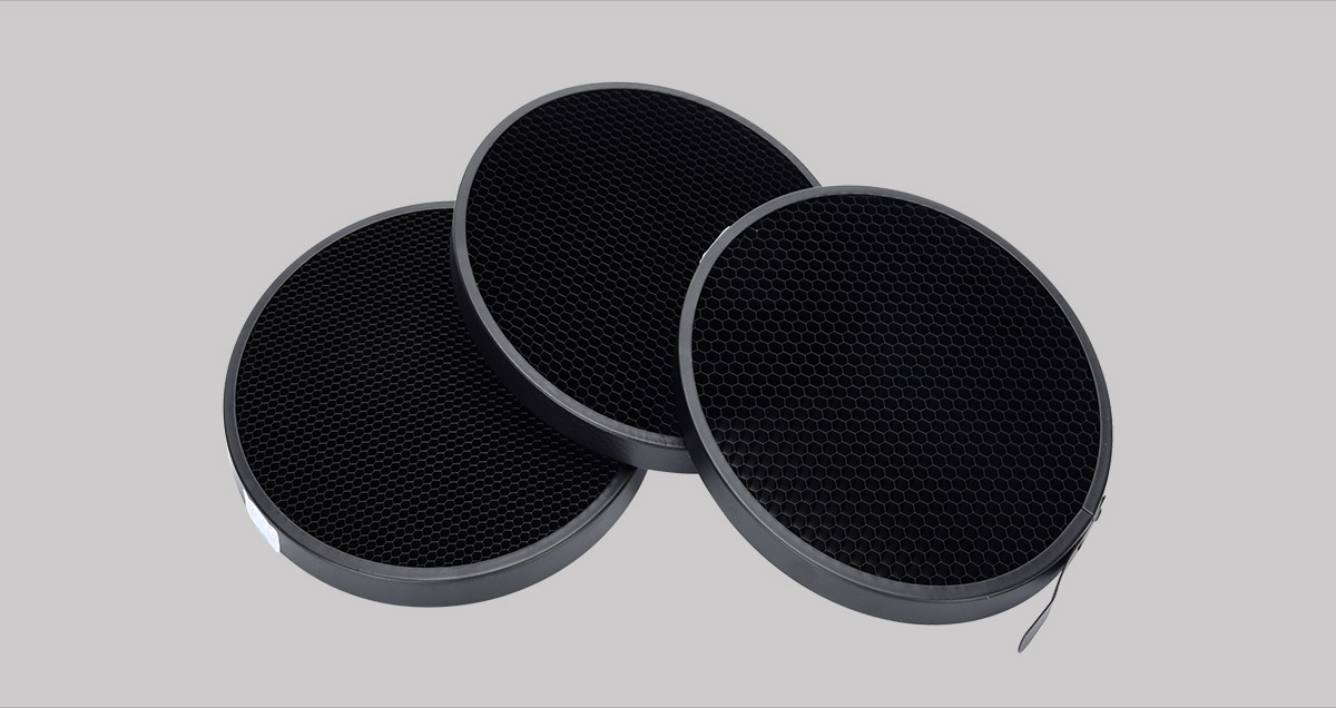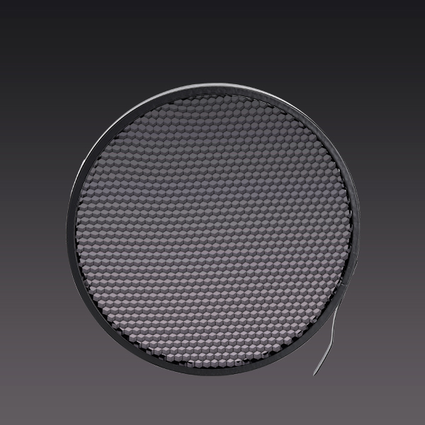“Honeycomb” named as its shape looks like a honeycomb. The honeycomb is woven by black metal sheet as a circular or rectangle filter and place in front of reflector. Once add the honeycomb filter, the light illumination direction is under control and limited within specific area thus the object become more 3D shape. The luminous flux of the light can be controlled by adjusting the lattice size of the honeycomb . The honeycomb cover can also be used as a fill light for portraits or backgrounds, which can better highlight the atmosphere and sexiness of the subject.